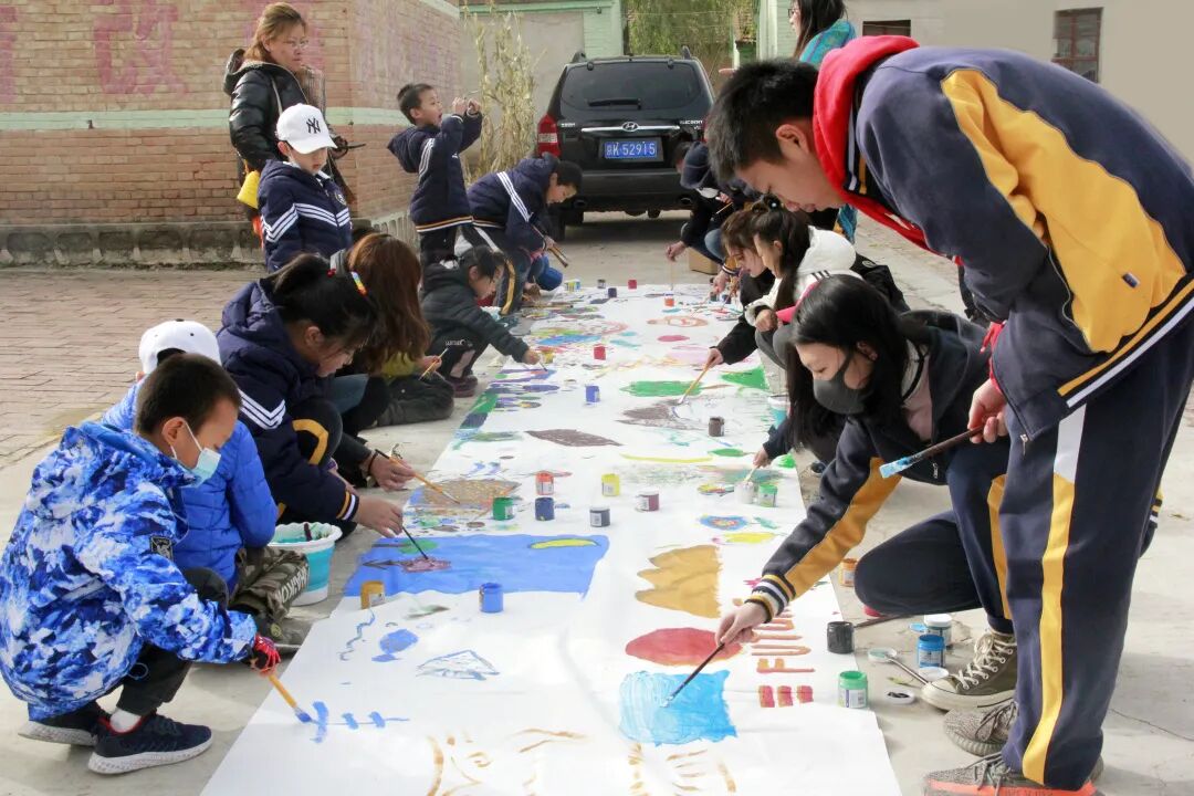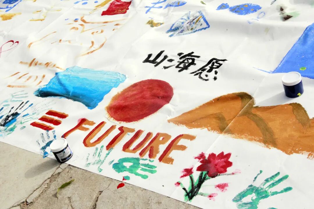 他还走进了北京新东方双语学校“手拉手”小学——王喜洞小学,他看着孩子们小小的、略显孤单的身影,总想起自己少小离家求学的经历,更激起了他对孩子们的怜爱,于是带着老师、学生一起创作出了《我们的明天》长卷,郑重地写下“山海愿”的主题,预示着所爱隔山海,山海皆可平。他说:“我们是不同的个体,可能我们是山川、他们是海洋,但是我们拥有共同的心愿,希望每个人都可以接受良好的教育,都可以走向更加广阔的世界。”