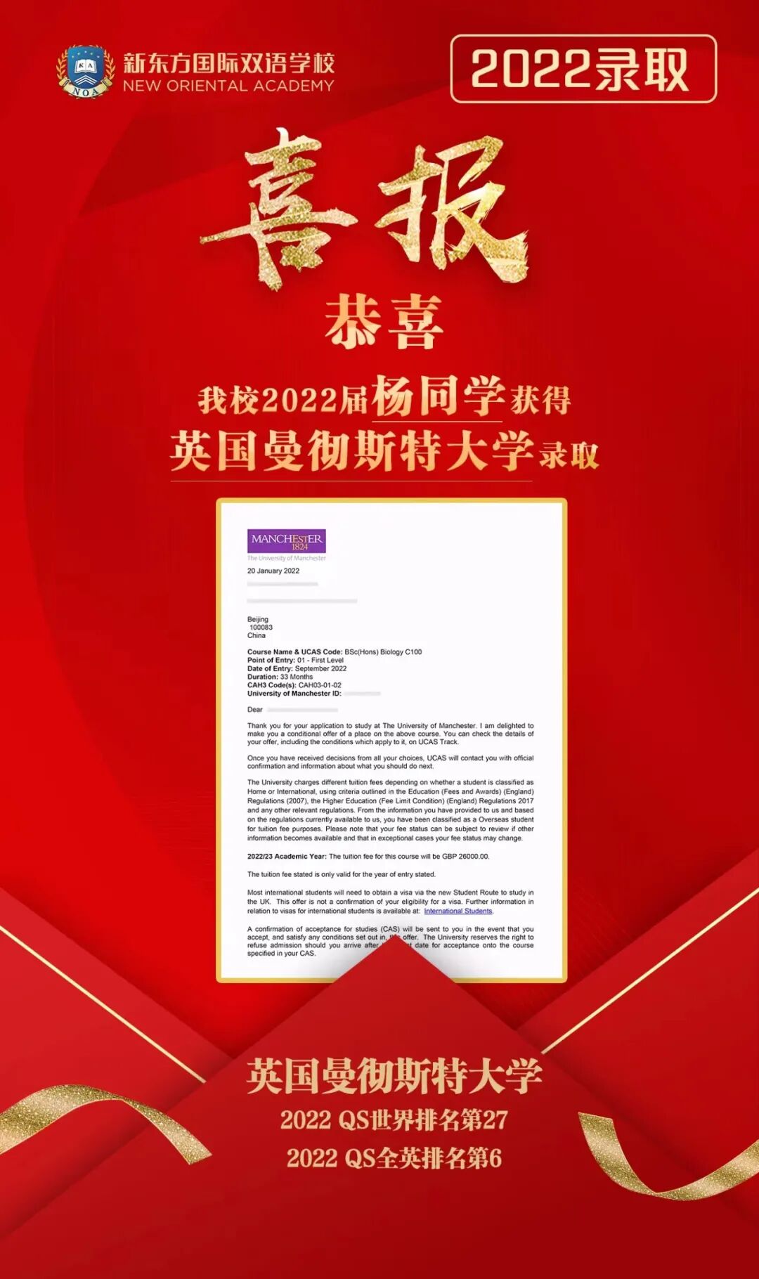 就是这样一个守少则固、力专则强、勇敢追梦、不懈努力的女孩,将在曼彻斯特大学开启新一段人生旅程,希望她与挚爱的生物科学携手相依相守,实现儿时纯粹的梦想!