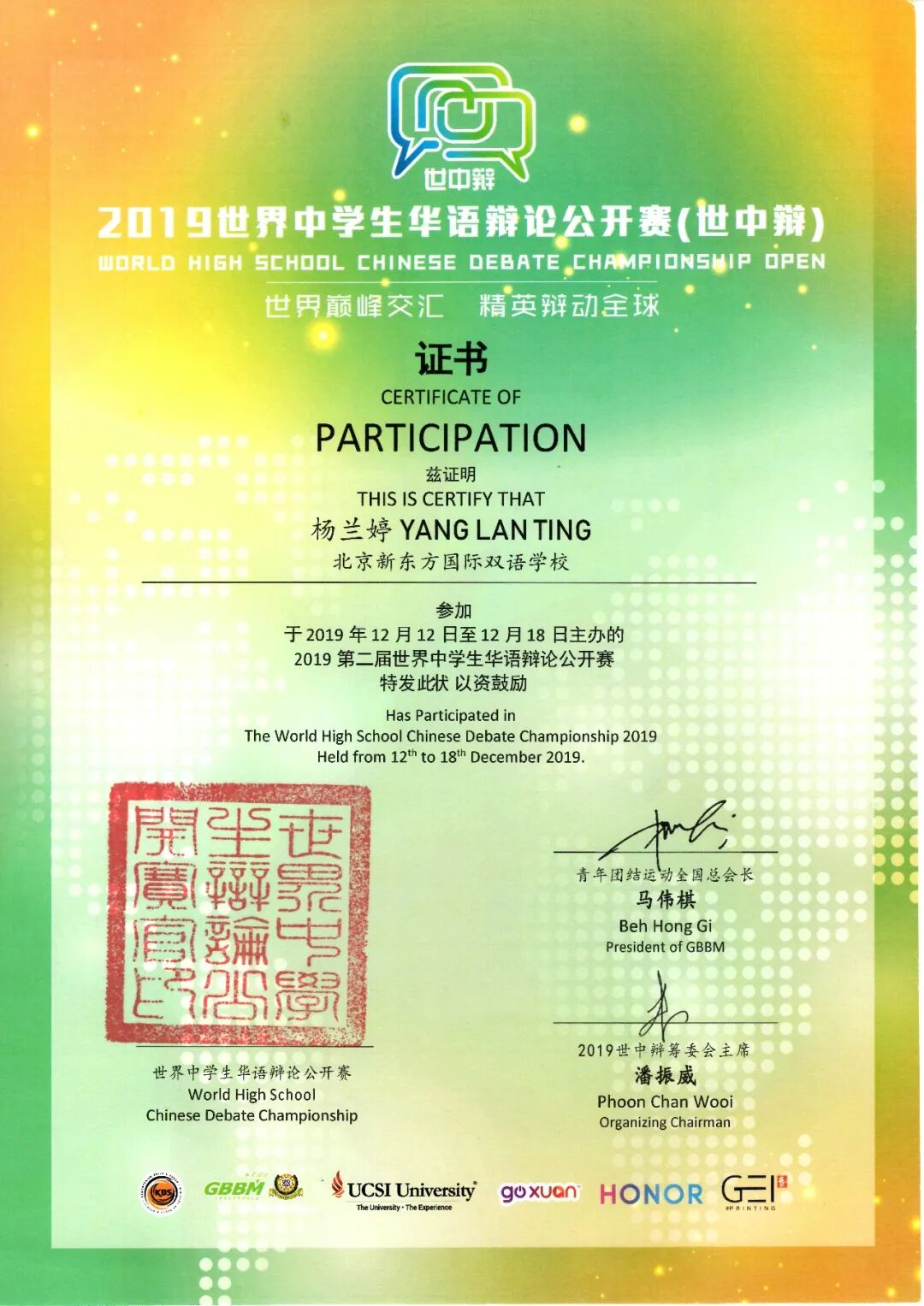 当拥有理科思维的杨兰婷投身辩论大军,她的观点总是新奇又充满哲理,在2019年马来西亚举办的世界中学生华语辩论赛中,她和小伙伴们火力全开,在六天的时间里先后赢了澳大利亚、中国香港多支队伍,跨入了世界中学生华语辩论界八强,虽然最后一场淘汰赛遗憾落败,但是在杨兰婷看来,那些为比赛奋战到深夜的执着、从寒冷的北京到湿热的吉隆坡、从胜利的欢喜到失败的淡然,都已经成为了她成长路上的一枚火种,在这里汲取光、汲取热、也汲取爱。